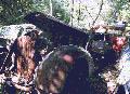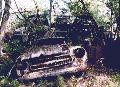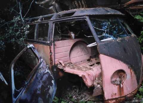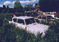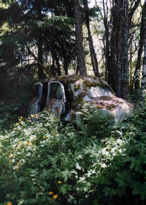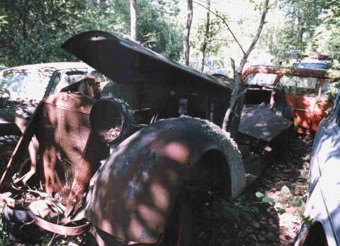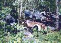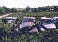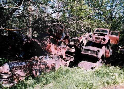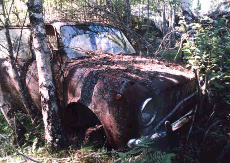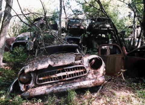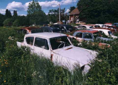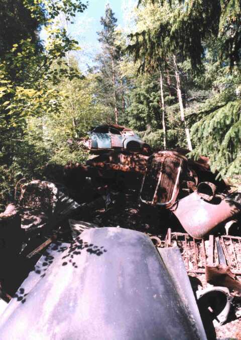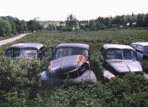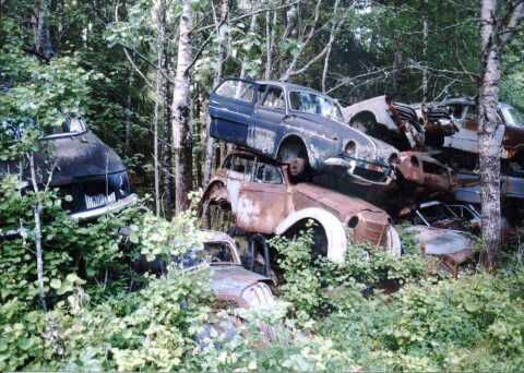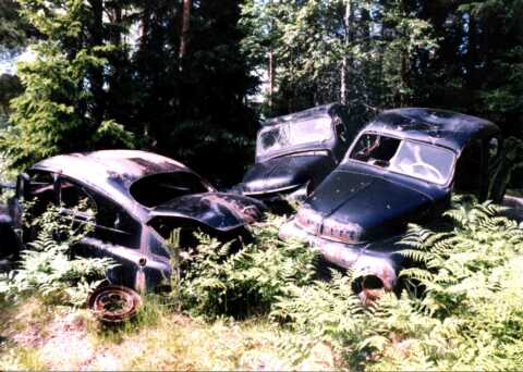 Nach ca. 20 km Fahrt über Waldwege, übersät mit Schlaglöchern, verlieren wir den Glauben an den Geheimtip. Die Halbinsel hier an einem See in Südschweden nahe der norwegischen Grenze muß doch bald zu Ende sein - und warum sollte denn ausgerechnet hier jemand ein Schrottplatz aufmachen? Doch plötzlich stehen die ersten Wracks ganz einfach im Wald verteilt, eine Lichtung öffnet sich: Alles voll mit Old- und Youngtimern! Buckel-Volvo, Saab 90, Mercedes, Borgward..... alles der letzten 40 Jahre scheint vertreten zu sein. Der Zahn der Zeit hat seine Spuren hinterlassen, lohnende Objekte gibt es keine. Schätzungsweise 400 Wracks liegen im Wald und über die Wiesen verstreut, teils hochgestapelt und in gefährlicher Schräglage oder von massiven Bäumen zugewachsen, teils schön nebeneinander aufgereiht. Eine eigenartige Friedhofsstimmung macht sich vor allem im dichten Wald breit. Auf den Wiesen hat man den Eindruck, man sei in einer Auto-Wüste: verlassen verbleichen die Vehikel-Gebeine in der Sonne. An diesem Zustand hat sich die letzten zwanzig Jahre nichts geändert.